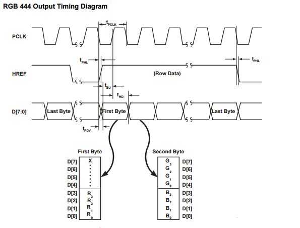 En este paso obtendremos los valores de los píxeles desde los pines d0-d7 por usar Vsync, href y pclk señales. VSYNC determina que el marco está siendo enviado. Href indica una línea de envío. PCLK determina que un nuevo byte está disponible. Como puede comprenderse desde el diagrama de momento tenemos que obtener el nuevo byte D [0:7] en cada flanco ascendente de pclk (posedge) donde Vsync es 0 y href es 1. Ov7670 tiene una salida en varios formatos. (RGB 565, RGB 555, RGB444 YUV / YCbCr4:2:2). En mi proyecto utiliza los valores de registro necesario para obtener el formato RGB444.