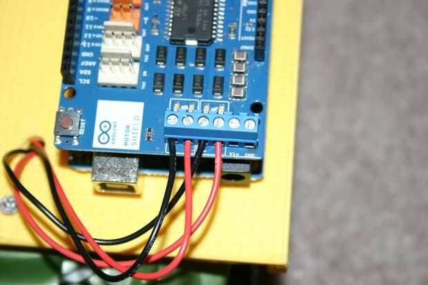 La cinta o el escudo de Arduio Motor a la base de tornillo.  Sujete los cables del motor para el protector de Motor de Arduino.