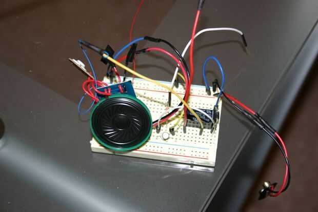 Registrar el "chirriaba" en el módulo de sonido.  Quitar el botón de "play" y la soldadura de dos alambres pequeños (yo uso alambre de envoltura) en los rastros que se encuentran bajo el boton "play".  Usando un protoboard, configurar el relé, transistor de módulo de grabación.