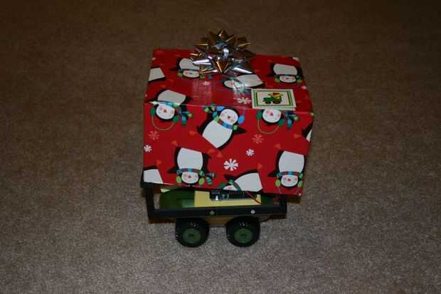 Para fijar el paquete y coloque el interruptor "on".  Usted debe oír un "chirriaba".  El paquete debe permanecer todavía.  Cuando alguien levanta la etiqueta de regalo, el paquete tendrá gritar cada vez que golpea un objeto y continuar corriendo hasta cogido y desactivado.