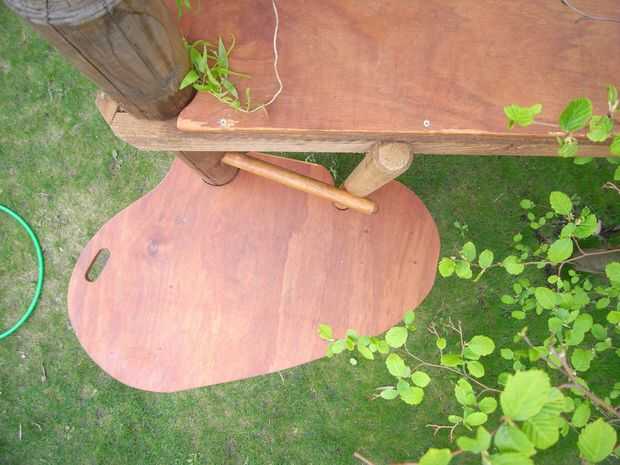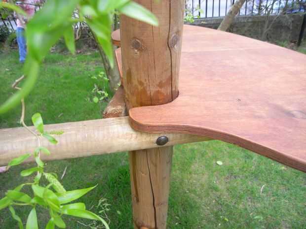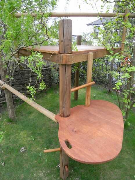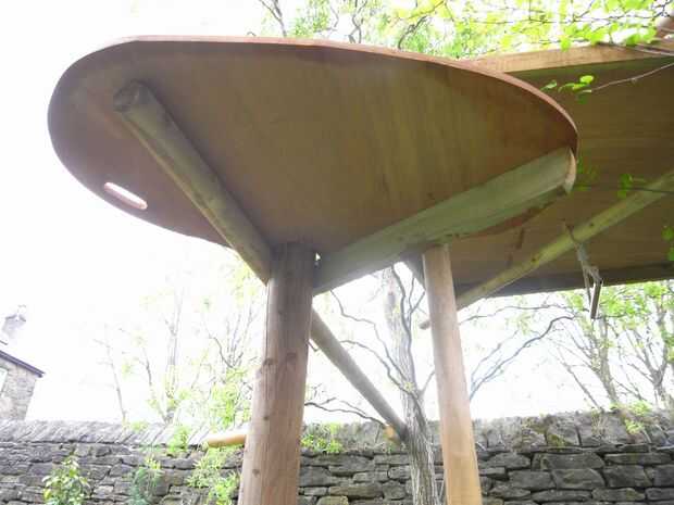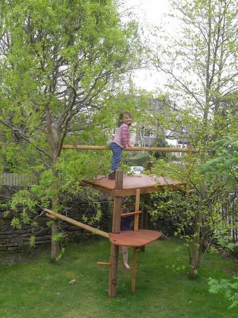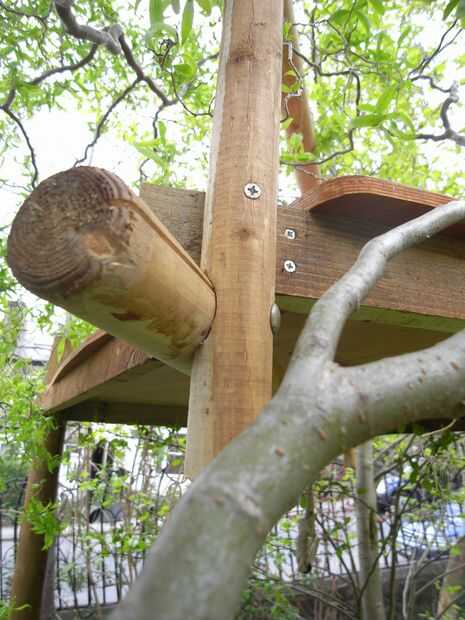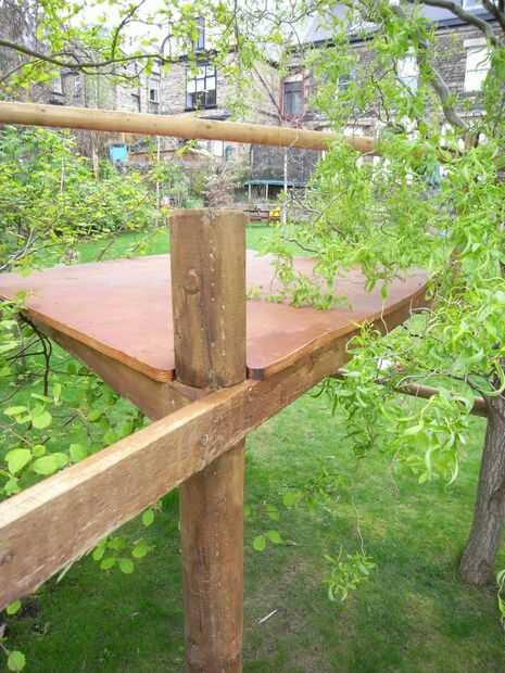 Pero ninguno de nuestros árboles son realmente lo suficientemente grande como para una casa de árbol adecuada, y un montón de marcos de subir son un poco duro en el ojo. Esto es algo entre ambos extremos. Es apoyado en parte por los árboles y está parado en parte en las piernas. Todavía se balancea con los árboles por lo que tiene que treehouse "sienten" y que toda la madera se integra bastante bien.