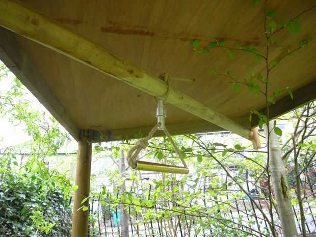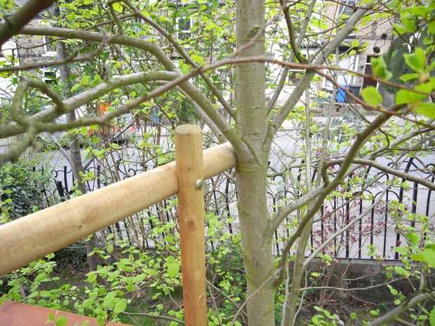 Debo insistir en que no clavo de tornillo ni atar a los árboles, solo cuelga. La única excepción es la horizontal baja al sauce retorcido que tiene una especie de "pinza" alrededor de la rama para evitar que cuando estéis en la pequeña plataforma de elevación. Esto debe obtener "partido abierto" por la rama crece... o al menos esa es la teoría, siempre puedo desenroscarlo.