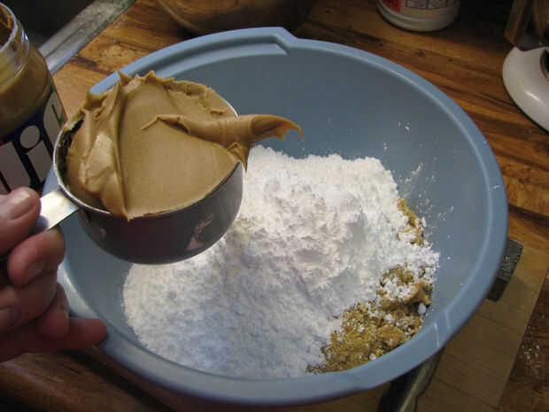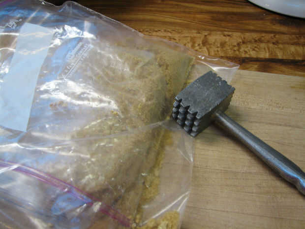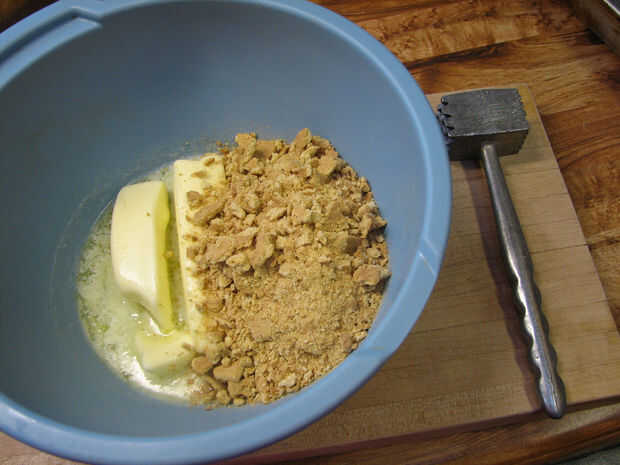 Poner mantequilla en el tazón y mezcla microondas aproximadamente 1 minuto para ablandar y empezar a fundirse. Mientras estás esperando la mantequilla a derretir, triturar las galletas. Me Coloque en una bolsa de ziploc de tamaño de cuarto de galón y coloque en una bolsa de tamaño galón. Agregar a la mantequilla. A continuación añadir el azúcar y la mantequilla de maní y mezclar.
