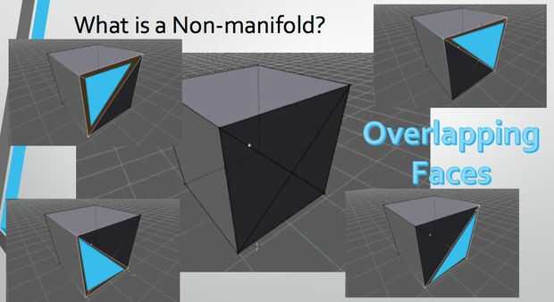El último tipo que explica muchos errores en la impresión es cuando la misma geometría ocupa el mismo espacio. En la foto de arriba vemos que cuatro caras ocupan el espacio de otro. Esto también podría ser dos puntos o vértices que se encuentran en el mismo lugar, o dos bordes uno encima del otro. Esto es muy fácil hacerlo accidentalmente en cheque tan a menudo para no-variedades de modelado.