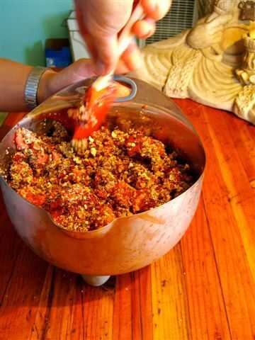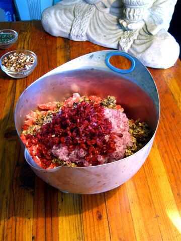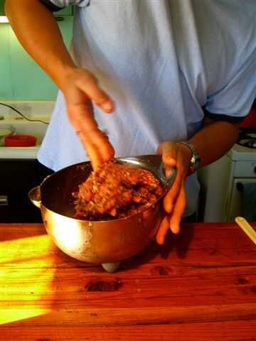 Mezclar bien. (No es masa de panqueque, no se mezcle). Puede empezar con una espátula pero es la única manera de realmente asegurarse de que se incorpora con las manos. Sabes tu haces este derecho si daño a sus manos. Si se hace correctamente usted debe estar en el borde de la congelación.