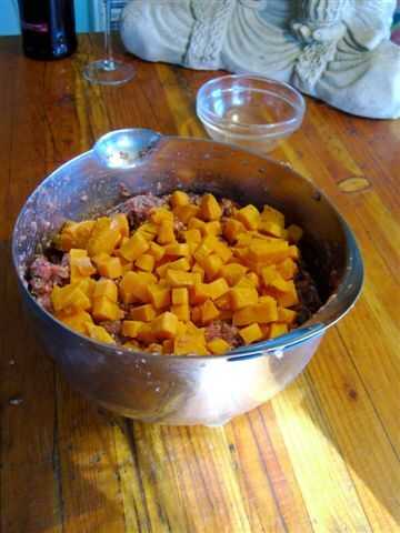 En este punto suele añadir algún vino tinto, preferiblemente un puerto. Agregar las batatas en cubos.