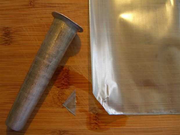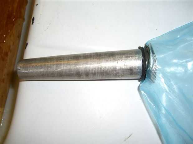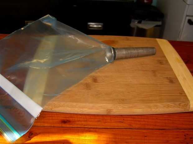 Cortar una esquina de la bolsa del congelador, sólo de un 1/4". Empuje el tubo de relleno a través de él desde el interior. Use bandas de caucho para asegurar la bolsa en el tubo.