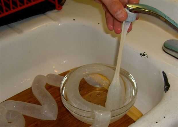 Las tripas se lavan fácilmente haciendo pasar agua a través de ellos. Después de enjuagar, dejar de lado en un bol de agua fría.