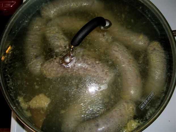 Hervir la salchicha en caldo de pollo durante unos 20 minutos.