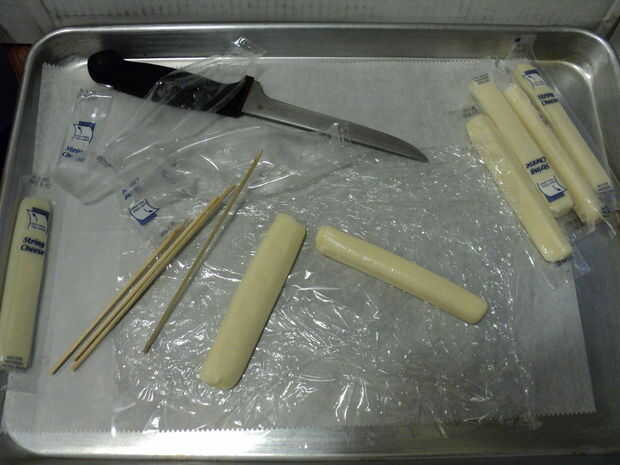 Saque el queso del embalaje plástico, mina vino individualmente envuelto servir los paquetes de stick.