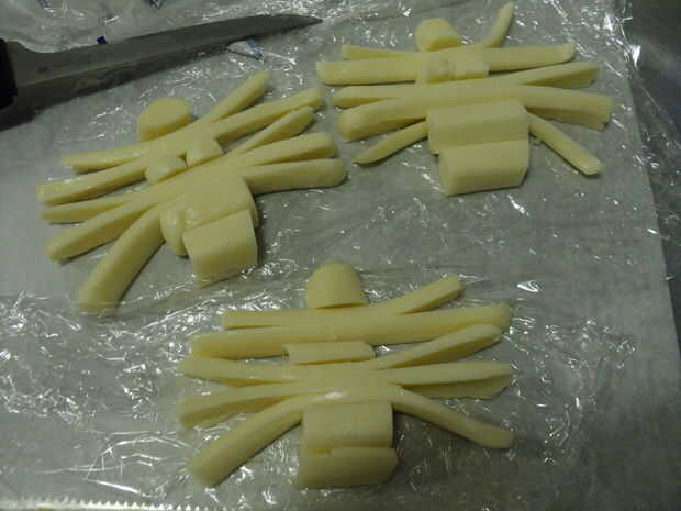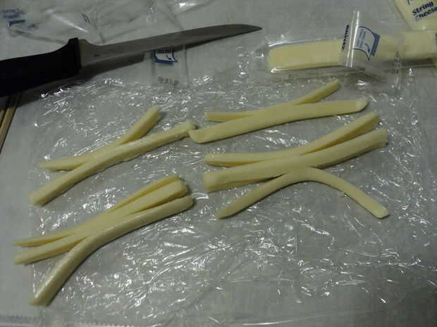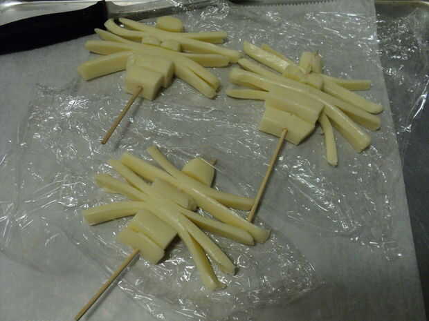 Corte a sobre a mitad de camino en cada lado para formar 3 patas más delgadas del palillo de un queso.