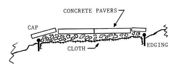 Ver final de la porción terrestre de la rampa de muestra que no se ha hecho ninguna excavación. Tela de jardinería era colocada en el suelo y cubierta con suficiente gravilla para nivelar la grava cama lado a lado. Bordes de césped pesado fue ejecutado junto con contener la grava. 3' largos tramos de grava eran enlucidos y hecha planas 8.metal, dos adoquines en lugar de lado a lado, luego otra sección de grava enlucida y planas. Esto produjo una rampa que fue nivelado de lado a lado pero que progresó la subida gradual de agua a una línea que rara vez sería cubrirse por las mareas. Tapas de bloques de hormigón se agregaron para mantener la acción de las olas de la dispersión de la grava.