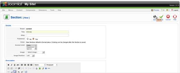 -En primer lugar crear una nueva sección. > Artículos > Secciones > (nuevo) llamé a mi sección de páginas principales, se guardo la página y otros artículos importantes en esta sección. Cuando listo, no olvides guardarlo.