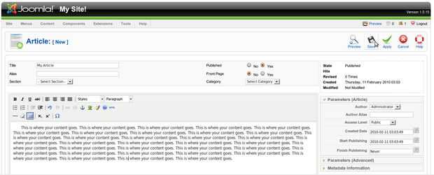-En tercer lugar, vaya a la sección de artículos y crear un nuevo artículo. Si usted planea usar este como tu página de inicio, puede notificar a sus espectadores que su sitio está en construcción y seguir con una intro a su sitio. (Si esta es tu página de inicio, asegúrese de cambiar esa configuración en la página de artículos)