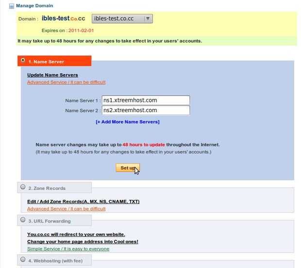 Estoy seguro que usted fácilmente podrá ingresar sus credenciales en el formulario de registro, pero si usted necesita cualquier ayuda me puedes contactar. Sin embargo una vez inscrito, se le pedirá configurar su dominio. Esto es relativamente fácil. Vamos a usar DNS (servidores de nombre) debido a su relativamente fácil pero no provocar los problemas esa url redirección puede causar. Si su uso xtreemhost los servidores de nombres son: