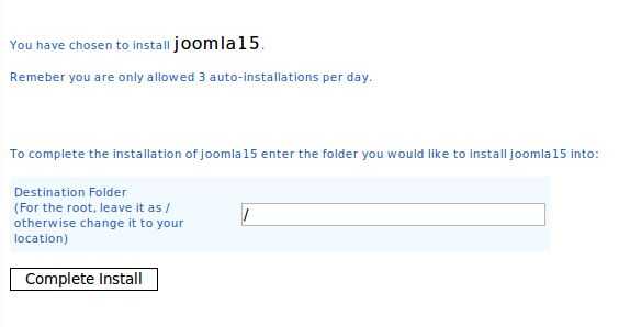 Al llegar a la siguiente página, dejar solo la carpeta de destino en "/" la razón de esta parte de la instalación es si quiere instalar un foro al lado de joomla en decir www.yoursite.co.cc/forum podría hacer tan. Pero por el momento solo dejarlo en la raíz.