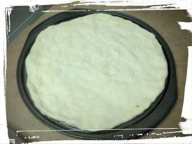 Tomar la masa y extenderlo en la bandeja. Si no parece que quieren volver a sembrar, o si es demasiado elástica, dejar reposar otros 20 minutos (esto permite que el gluten para relajarse y estirará más fácilmente).