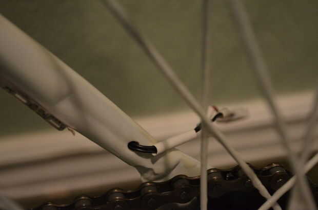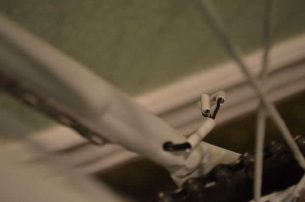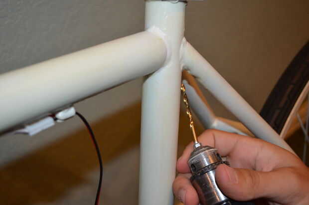 -Cuando usted alimenta el alambre a través de la bicicleta, es tan ligero que puede no tirar de sí mismo hacia el otro agujero. Hice algunos improvisar y usar la cadena de un collar de cadena de perro, había prensado de un extremo al alambre y alimenta el otro extremo a través de. Esto hizo pesado a caer hacia el otro agujero. Pues yo utilizaba una luz brillante y unos alicates muy estrechos para sacar el cable hacia fuera el resto del camino.