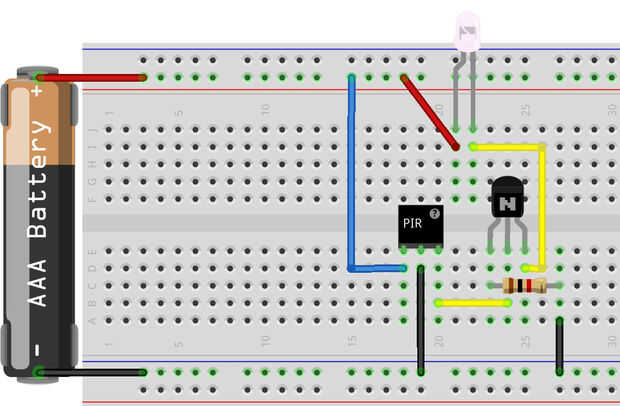 Ésta es la disposición de protoboard para la configuración 2, pero tendrás que usar tu imaginación para algunos de los componentes (no pude encontrar las adecuadas en Fritzing). En primer lugar, pretende la batería es un A23 en lugar de AAA. En segundo lugar, imaginar el solo LED se muestra realmente la pantalla del panel de 3 x 3 que estamos utilizando. En tercer lugar, la pequeña casilla PIR es realmente el sensor de PIR. Configuración 2 es el mejor circuito para este proyecto.