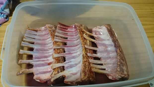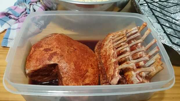 mi segunda parte, tuve el Carré de cordero, pierna de carnes de cordero y de la costilla. había sazonado el filete con sal kosher y pimienta y lo deje reposar en la nevera por 48 horas. para mi cordero yo los había aderezado con pimentón, sal y pimienta luego de ajo en polvo. Yo lo deje reposar en la nevera durante 24 horas. mi cordero obtiene un segundo marinado para que lo derrita en la boca tierna. después de las 24 horas de descanso remojo en vino tinto, vinagre de vino tinto y Romero para otro 24 horas.