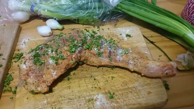 les sazonado generosamente con sal, pimentón y pimienta y lo deje reposar en la nevera durante 24 horas luego cubierto con costra de hierbas (perejil, tomillo, Romero, hojas de cebolla) y listo para asar.