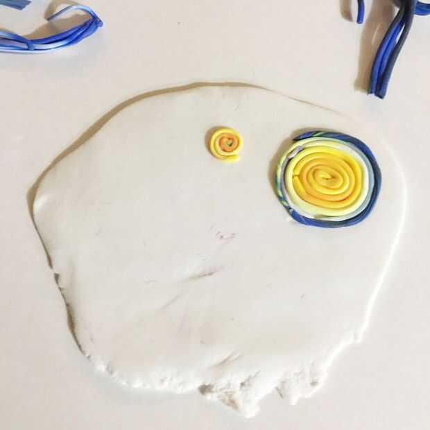 Si miramos la noche estrellada de Van Gogh, hay muchos remolinos y pinceladas cortas. He intentado recrear que un grande formando remolinos pequeños múltiples de las estrellas y la luna. He añadido algunos remolinos azules y verdes para imitar el viento remolino (al menos eso es lo que creo que es). Luego he intentado llenar los puntos vacíos con espirales apretadas y sueltas.