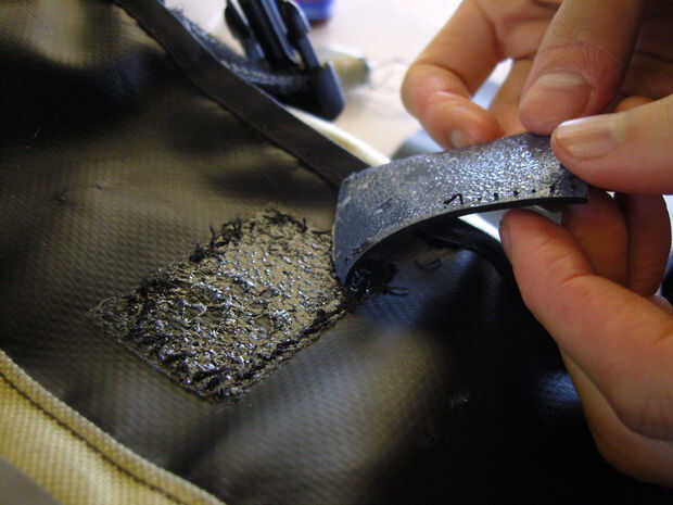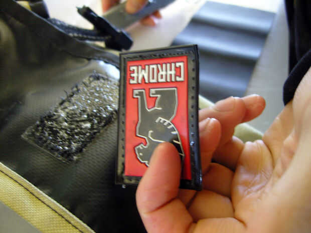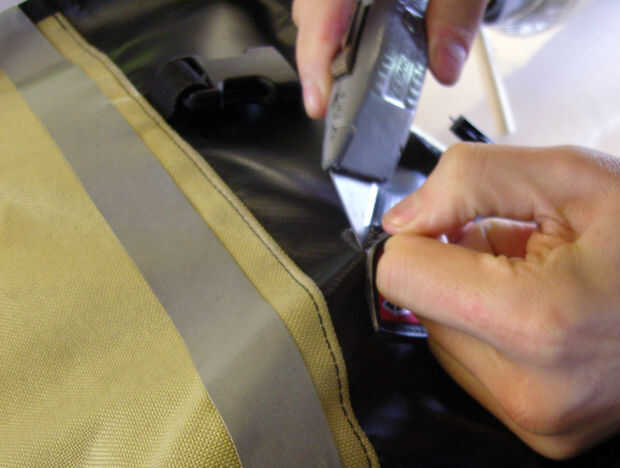 Tienes que sacar ese viejo parche de Instructables. También, ya que quiero la tela reflectante en posición horizontal, me quitan los logo de cromo de la aleta. Sólo utiliza un cuchillo para cortar cuidadosamente las costuras, despegado el parche y frotó el adhesivo viejo.