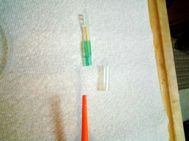 Por lo que acaba de seleccionar un diámetro de calor retráctil tubo que fue un poco más y luego el tubo que viene con el kit. Corte una longitud adecuada de la misma, había deslizado sobre la punta de corcho primero luego desliza la pieza de tubo de kit (con el cyalume en él) en la punta. Entonces es sólo una cuestión de reducción del encogimiento del calor tubería cómodamente en la punta del corcho y el tubo. Es el soldador. Que le da calor muy localizado tan sólo calienta donde usted lo desee.