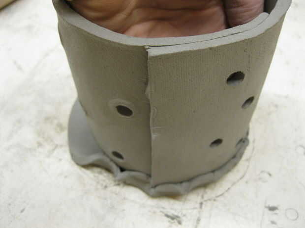 quitar arcilla extra. entonces alcance dentro de la base con una mano y con cuidado presionar el borde inferior de la pieza mientras presiona la arcilla en el exterior para satisfacer la