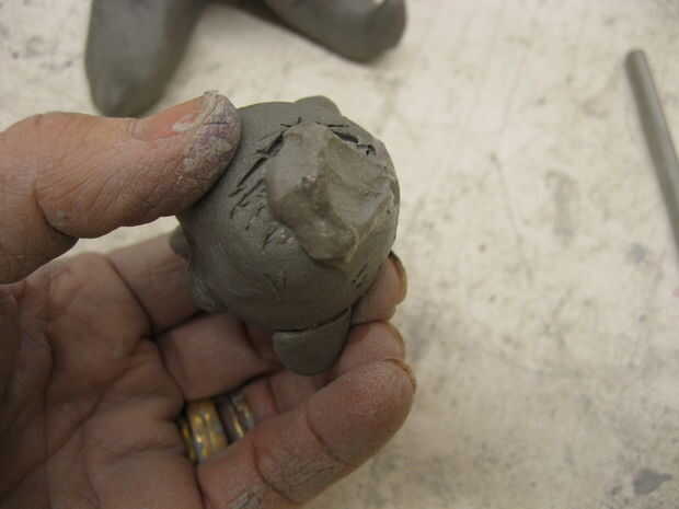 a continuación cubre las marcas scor con resbalón, resbalón es sólo arcilla muy húmeda.  Añadir agua hasta el polvo de arcilla y hacer una pasta. cuando estoy trabajando con mis niños que me refiero a la hoja como pegamento de arcilla porque eso es lo que hace, pega las piezas juntos. Si no se utiliza la hoja mientras la pieza se seca el barro se encogerá y las piezas se romperán.