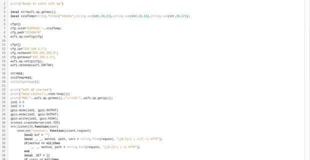 Bien la mayoría de ella se realiza. Todo lo que necesitas es el código LUA para convertir tu ESP12E en una web AP como servidor Web. Aquí encontrarás el código. Sólo copia el código en la ventana izquierda de su IDE ESPlorer y guardar como "init.lua" (este es el primer script que se ejecuta en el NodeMCU después de reset). El ESPlorer guarda automáticamente el código en la memoria de código NodeMCU.