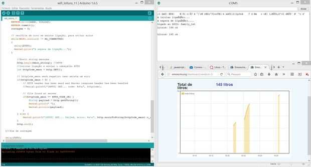 • El envío de una solicitud HTTP con la información sobre el total de litros en un servidor externo, ThingSpeak. Con la información enviada que ha creado un gráfico en EmonCms, http://emoncms.org/a21210&id=32359 que puede tener acceso remotamente y analizados en cualquier momento.