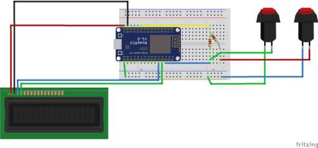 El diagrama de fritzing realmente muestra los cables que van desde el esp a la pantalla, esto no es realmente qué necesita conectar esto, es necesario utilizar el módulo i2c que convierte la salida serial de la SDA y SCL a la URL que la pantalla lcd debe mostrar el texto.