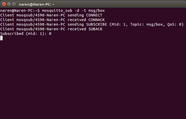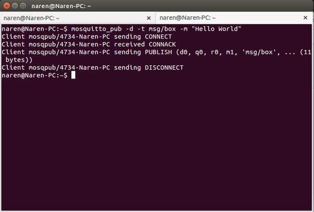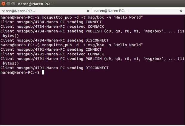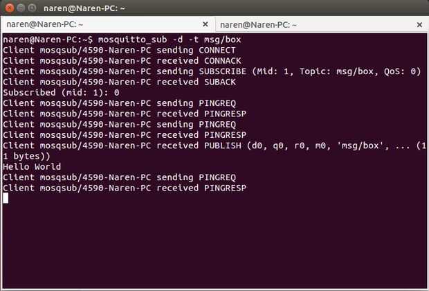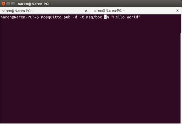 Aquí el "cuadro de mensaje" se llama un tema puede ser cualquier cosa (ej. puede ser analógica o sensor o sensor digital o RelayControl etc.). Tampoco uno puede suscribirse a un tema (primer comando lo hizo) o puede publicar en un tema (segundo comando publicado "Hola mundo" al msg/cuadro de tema) una vez que se envía al agente todos los dispositivos recibirán el mensaje "Hola mundo" si y sólo si ha suscrito a ese tema.