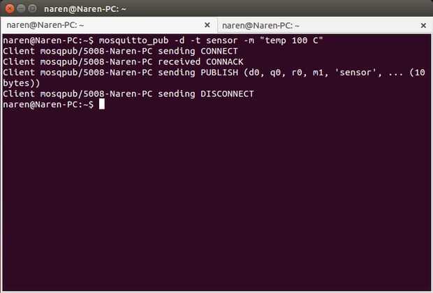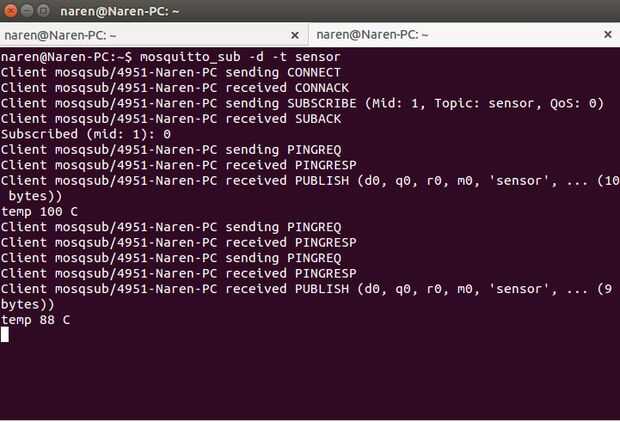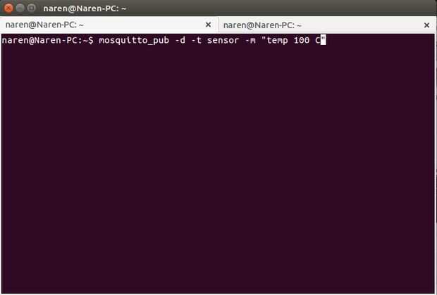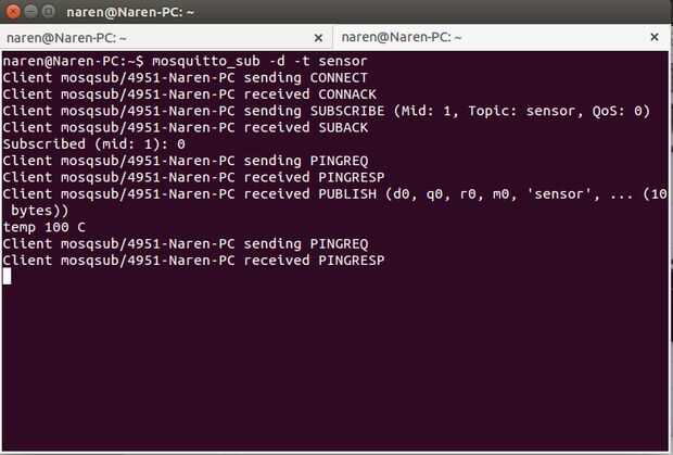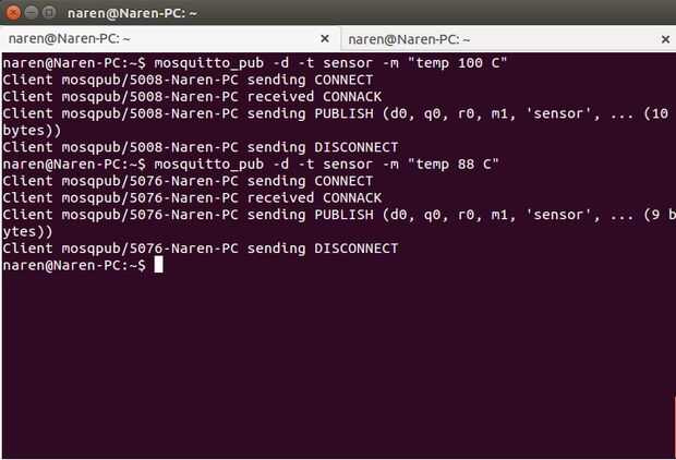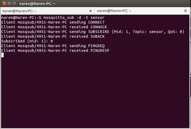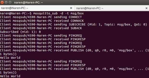 usted debe conseguir "Hola mundo" en la primera ventana a (donde escribiste mosquitto_sub -d -t Hola mundial).
