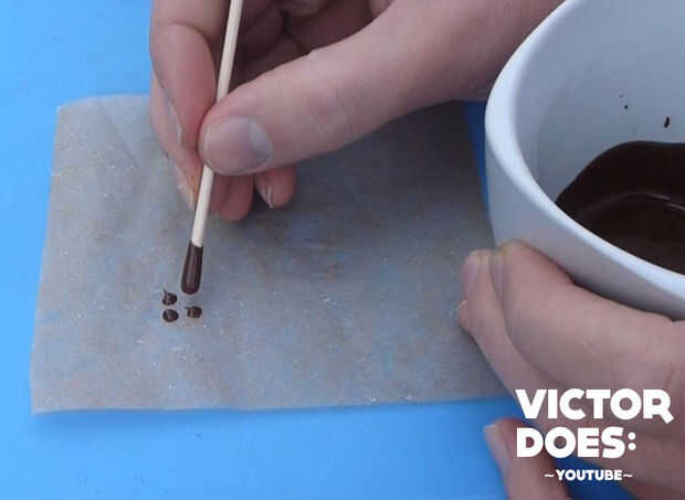 Luego llevar el papel para hornear, el chocolate derretido y palillo de la parrilla. Utilizando el lado plano va a crear pequeños puntos de chocolate chips/puntos que actuarán más tarde como ojos.