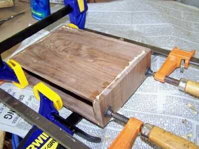 Aquí puede ver la funda pegado y afianzado con abrazadera. Haga lo que pueda para comprobar que el conjunto es cuadrado. Raspe el exceso de cola tan pronto como sea posible.