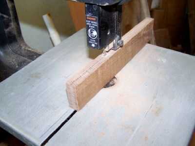 Corté trozos de mi Junta 1 1/2 pulgadas de ancho. Entonces re-había aserrado esas piezas en mi sierra. Primero trataron de fijación de un tope a la mesa de Sierra de cinta, pero la hoja vagó y desperdicié un pedazo de madera. Conseguí mucho mejores resultados dibujando una línea y seguirlo.
