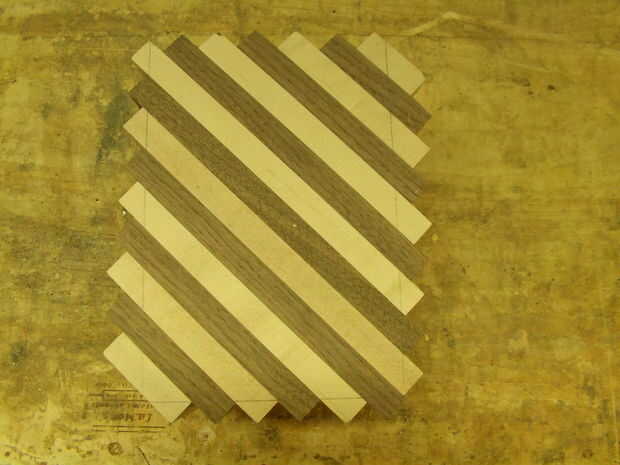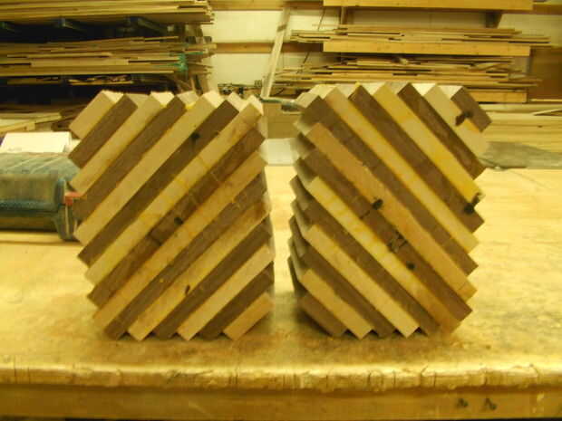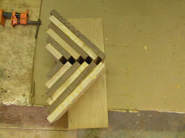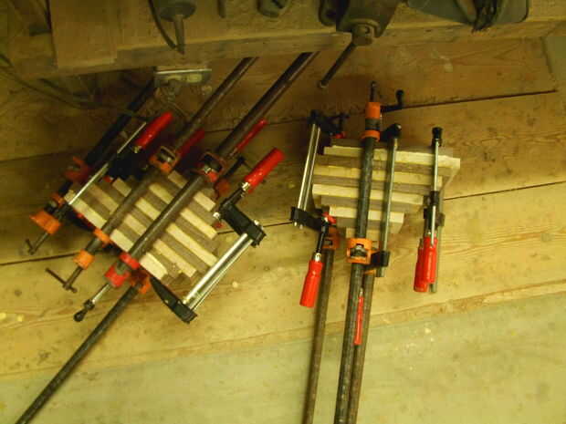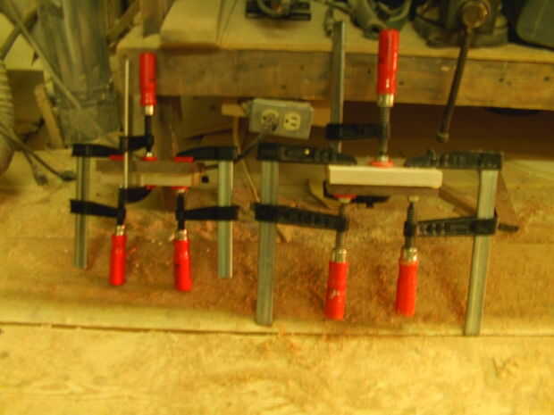 Como se puede ver que es pegar dos separados bloques. Comience en una esquina de cada cuadra y dry fit un bloque como en la imagen 6. Entonces empezar a pegar en uno de los rincones. No trate de pegar más de una pieza en un momento en su bloque, la razón de que es que hará que todas las piezas de proa y tendrás problemas cuando termines. Asegúrese de que hay una capa de pegamento sobre cada pedacito de por lo menos una de las piezas antes de ponerlos juntos. Si no, que allí ser grietas entre sus piezas cuando se enciende el listón, habrá también será más peligro de que aparte del vuelo. Ponga algunas abrazaderas en el medio para que no inclinarse tanto. Para hacer un uso más fácil, sujeción algunos espaciadores para ayudar a sostener la pinza como en el cuadro 4 medio camino a través del proceso de encolado, busque cómo mucho es inclinando manteniendo un borde recto hasta él. Si está arqueada sobre 3/32 '' debe arena por el medio hasta que esté perfectamente plana.