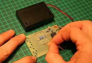 La NoiseAxe jugará 8 diferentes notas, cada nota se juega tocando una de las patas de la 8 resistencia en la parte inferior derecha del PCB con el hilo de la aguja. Puede cambiar el nivel de modulación variando la luz que entra en la fotorresistencia, creando un efecto de vibrato. Esto se hace poniendo el dedo o brilla una antorcha pequeña sobre el fotorresistor.