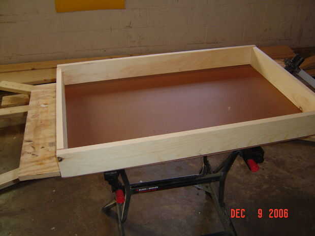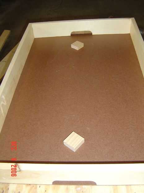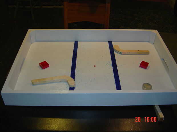 Se puede personalizar poniendo pegatinas de NHL en los tableros. El disco fue hecho de pino macizo con una broca Sierra de círculo. Los palillos fueron cortados del mismo material utilizando una sierra de calar. La parte inferior es masonite con dimensiones de 24 x 36 pulgadas... Usé el Masonite gruesa para que no deforme. El resto es sólo de 3/4 de pulgada de pino. Fue pintado con pintura acrílica. Usé De alto brillo para que estuviera menos fricción.