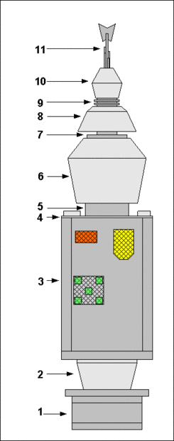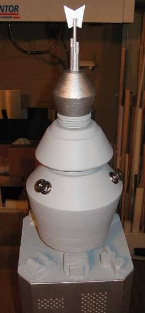 La sección final en el modelo es una antena como pieza en la parte superior. Se hace de 3/16" y 1/8 tacos de diferentes longitudes. Hay una paleta pequeña pieza en la parte superior de la espiga del centro, que hecho de MDF de 1/8". El pedazo de centro del pasador encaja en un agujero correspondiente en la parte superior de la sección 10.