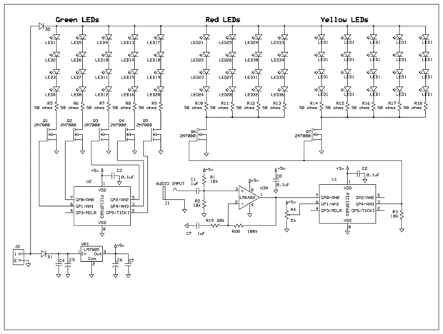 U1 es el procesador que se utiliza para producir los efectos de sincronización de voz. El análogo a la entrada del convertidor digital del procesador tiene un rango de entrada de 0 voltios a VDD, por lo que es la salida del amp op puede conectarse directamente a él. C2 es un capacitor de desacople en el pin VDD del U2. Q6 y Q7 son FETs utilizados para impulsar los bancos de secuencias de LED rojos y amarillos utilizados para los efectos de sincronización de voz. R10-R18 son actual limitación de resistencia para cada una de las cadenas de LED. R4 es un potenciómetro que permite configurar el nivel de entrada audio en la que el procesador establece la salida alta. R3 es un pull-down resistor que mantiene el LED apagado mientras que la salida del microprocesador está flotando justo después de la energía.