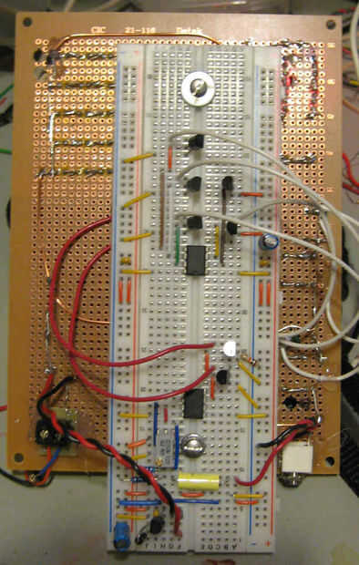Los dos circuitos de efectos de luz fueron construidos en una sola placa sin soldadura. Los LED ellos mismos fueron montados sobre un tablero de perf, con los LEDs dispuestos en grupos para alinear con los patrones de agujero en el modelo. La protoboard con los microprocesadores, FETs y el resto de la circuitería está montada en la parte posterior del tablero de LED. Vea las fotos abajo para ver el tablero y asambleas de placa de LED.