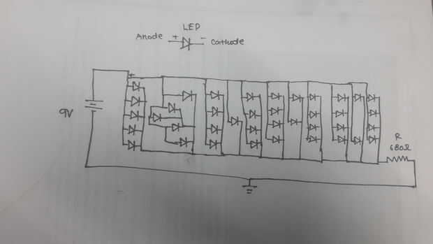 Editar: [vamos a conectar todos los LED en paralelo (medios positivos todos están conectados juntos y juntos todos negativos), luego conecte el terminal positivo de la batería a cualquier positivo de la LED(remember all LED positives are connected together).similiarly Conecte el terminal positivo de la resistencia a cualquier negativa del LED, luego conecte los aspectos negativos de la batería y el resistor].