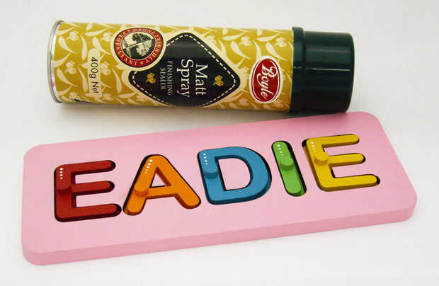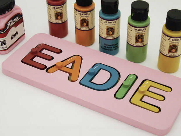 El rompecabezas se debe pintar con pintura acrílica no tóxica. Inicio sellando cada pieza con un sellador acrílico, esto es necesario porque el MDF se chupar un montón de pintura y sin primer sellado de la superficie necesita aplicar infinitas capas de color. Después de aplicar el sellador se puede empezar a pintar. He elegido colores vivos simples, color de rosa para el bloque de base porque se trata de una chica, cada letra es un diverso color brillante. El interior del bolsillo para cada letra fue pintado el color correspondiente de la carta para ayudar al niño con reconocimiento de color. Algunos puntos fueron agregados a cada letra para añadir un pequeño interés, podría añadir otras decoraciones para mejorar el aspecto personal de este regalo.