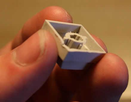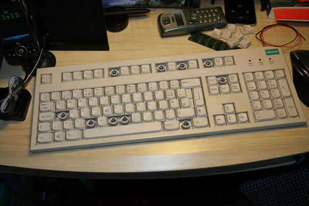 A continuación, usted tendrá que cortar las pestañas en la parte inferior de las teclas, esto se hace mejor con una Dremel/Sierra, estás apuntando para un buen acabado al ras en la parte inferior de cada tecla, para asegurar un sello hermético contra el palillo de la memoria RAM.