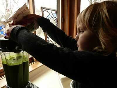 Mezcla para arriba en la posición más alta, añadiendo agua según sea necesario (generalmente alrededor de 1/2 taza en nuestra casa) y dejar actuar a su manera para realmente, realmente, suavizar. En este punto, puede volcar en la bolsa (12 oz) de fresas congeladas, o utilizar una pinta los frescos!
