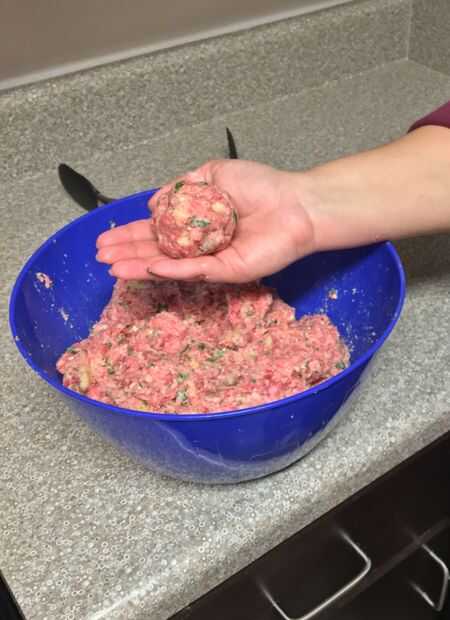 Tomar aproximadamente 4 onzas de la mezcla de carne y forma una bola girando la carne entre su palma en un movimiento circular (no mucha presión es necesario). Rodillo para sólo unos segundos, no tiene que ser perfecto. La bola debe ser sobre una palmera completa.