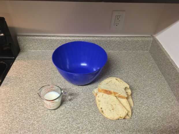 Coloque las rebanadas de pan en un tazón grande. Vierta 1/2 taza de leche en el tazón de fuente. Sentir el pan y si todas las piezas no son totalmente empapadas a través, agregar la restante 1/4 taza de leche. Transferir la mezcla de pan y leche en un recipiente más pequeño y ponerlo a un lado para su uso posterior.